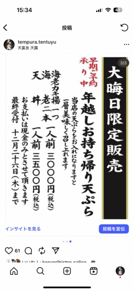 年越しお持ち帰り天ぷらのご案内お待たせいたしました!すでに多数のご予約を頂いており毎年大変ご好評...